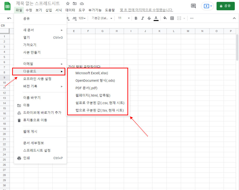 - 파일→다운로드→원하는 형식선택(엑셀, PDF 등)