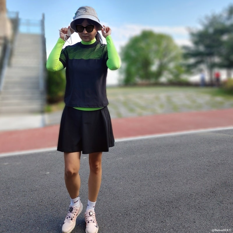 골프 니트와 함께 입을 골프 스커트로 선택한 아웃포켓 밴딩 추리닝 스커트! 니트와 같은 색감으로 세트로 입으셔도 좋고, 따로 입으셔도 좋아요! 전체적으로 소프트한 느낌이 나는 골프 스커트였어요. 특히 허리라인이 밴딩으로 되어있는데 자연스럽게 실루엣을 잡아주어 더욱 예쁘게 핏되게 입을 수 있었습니다.