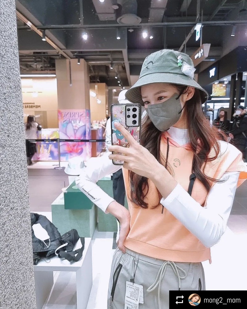 옆에서 보면 이런 느낌! 나는 위아래 모두 S사이즈로 했는데 55사이즈를 입는다면 S로 입으면 충분할 것 같아요.매장에 XS사이즈가 있어서 일단 분위기만 보려고 다른 스커트도 입어봤는데 맞긴 한데 뭔가 너무 핏되는 느낌이라 좀 부담스러워요. 정사이즈 55는 S로 상하 모두 선택하실 수 있습니다. 모자를 오프화이트로 할까 블랙으로 할까 고민했는데 블랙으로 잘 고른 것 같아요.(웃음)