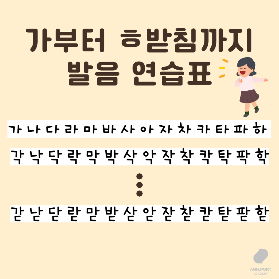 가나다라마바사 아자차카 타파하를 시작으로 받침을 ㄱ부터 ㅎ까지 넣어서 연습해보세요!