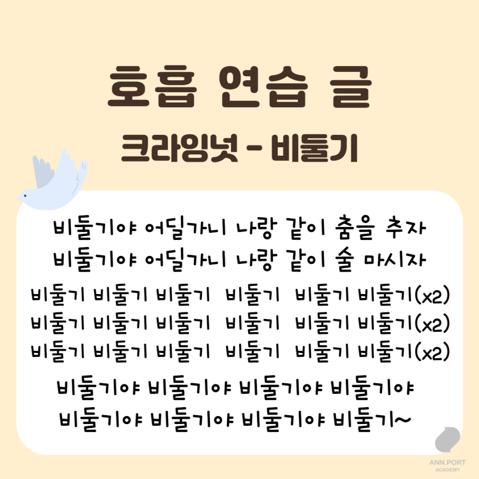 또한 매일 복식호흡 연습한 시간을 기록하고, 복식호흡 시간을 점점 늘려가는 것이 좋아요! 기록하면 눈에 보이기 때문에 전날 기록을 오늘을 뛰어넘어 성취감도 얻을 수 있을 것입니다. ?? 발음 연습! 발음 연습표 참고!