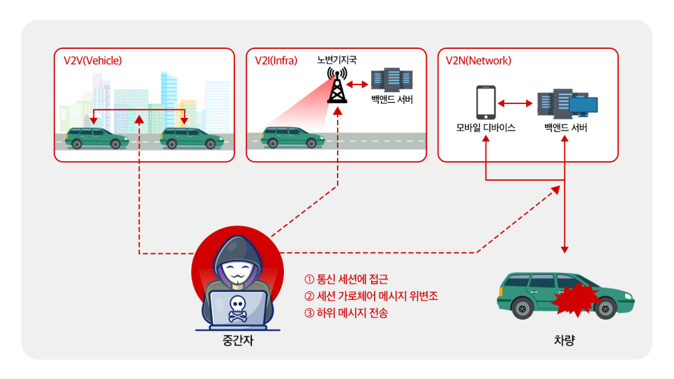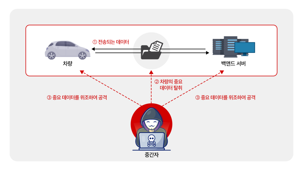 <중간자 공격의 위협 시나리오, 출처 : 한국인터넷진흥원, 스마트 교통 사이버 보안 가이드> 두 번째 시나리오 ‘중간자 공격’은 전송되는 데이터를 가로채 위조된 정보를 통해 백앤서버 또는 스마트카에 공격하는 행위를 말합니다. 실제 2017년 중국 해커들이 단돈 20달러(2만3천원)의 장비로 스마트카 신호를 증폭해 차 문을 열고 시동을 걸기도 했습니다. 현대에 운용되는 대부분의 차량이 스마트폰 앱, 블루투스와 연동된 다양한 커넥티비티(Connectivity) 기능을 탑재하고 있는 만큼 자동차의 안전성이 이제는 ‘사이버 보안’의 손에 달려 있다고 해도 과언이 아닙니다.