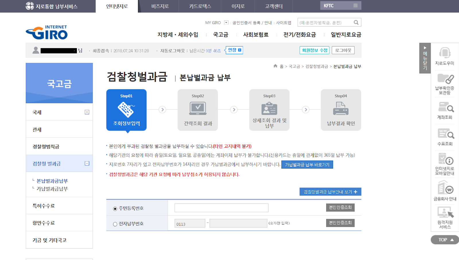 인터넷 납부는 Grow 접속 후 검찰청 벌금을 선택한 후 신용카드로 결제할 수 있습니다. 이 방법은 본인 명의의 신용카드로만 가능하며, 지인의 신용카드로 납부하기 위해서는 직접 당사자와 함께 해당 검찰청 기관을 방문하는 과정이 필요합니다.