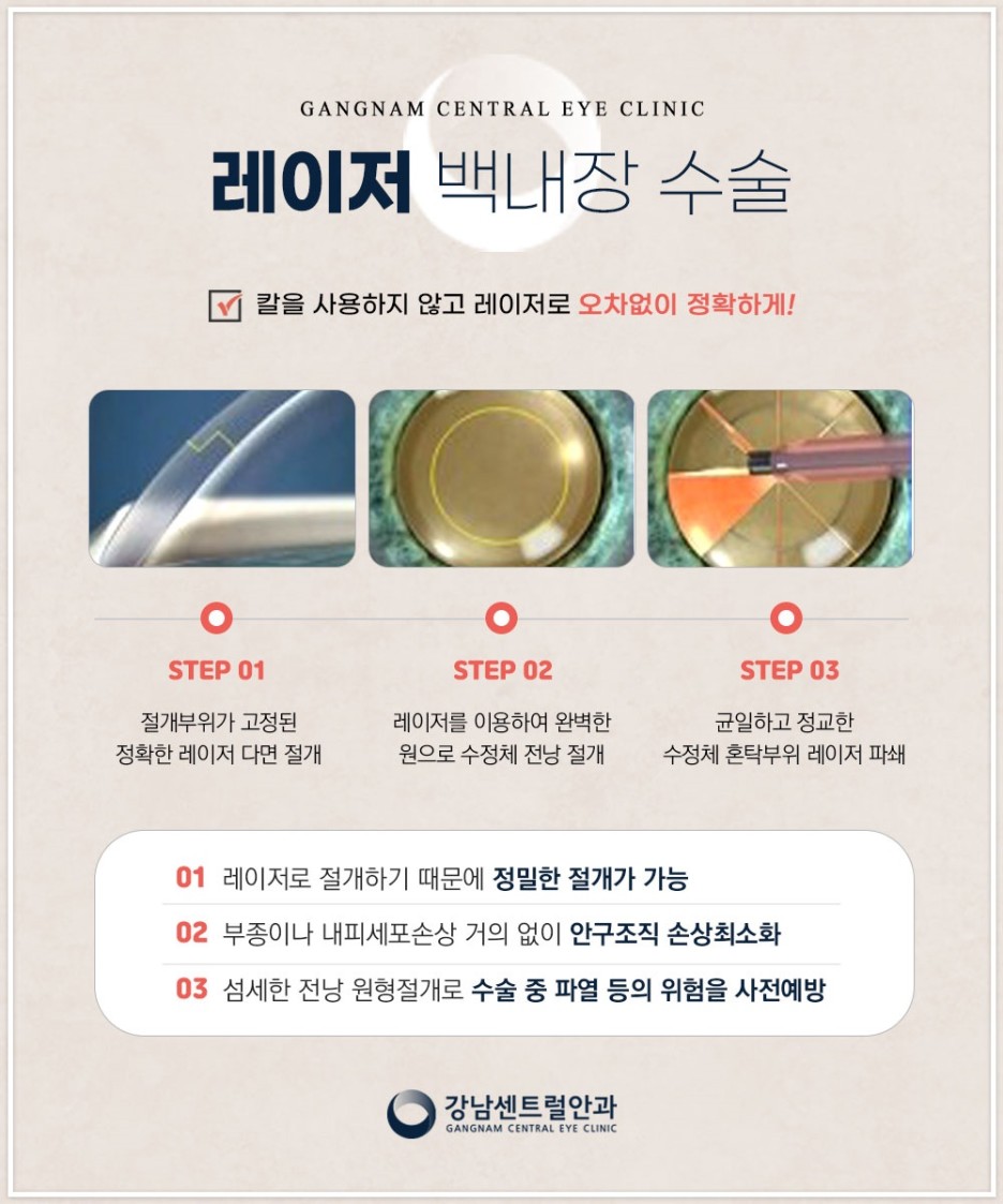 이에 따라 결과의 정확도나 성공률, 안정적인 부분에서 다소 아쉬운 부분이 있었지만, 레이저 수술은 수기 방식의 단점을 보완한 것으로 보다 정밀한 절개술이 가능하여 안구 조직의 손상을 최소화할 수 있고 수술 중 파열 등의 위험을 사전에 예방할 수 있습니다.