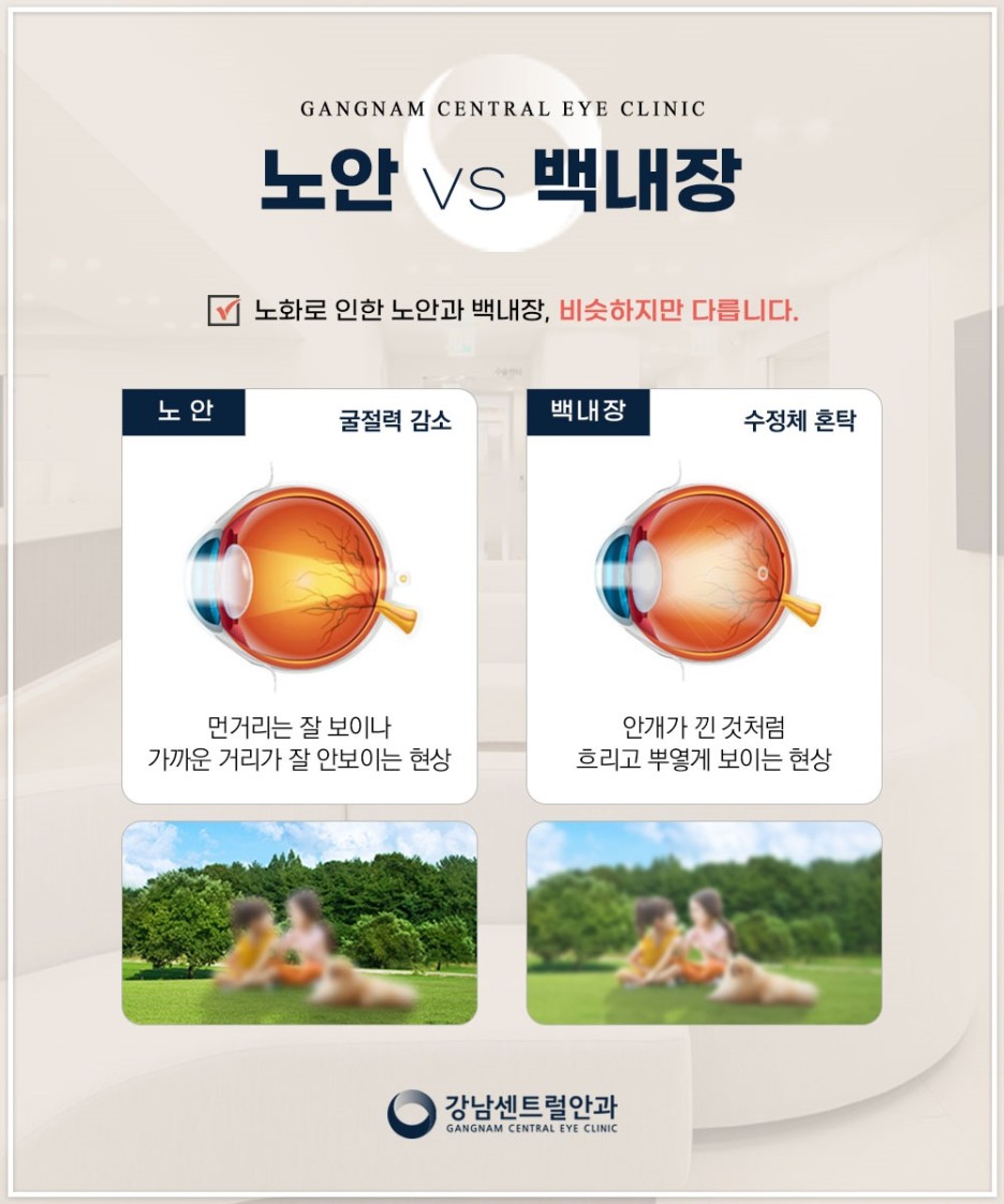 노안과 백내장은 시력저하가 나타나는 공통된 증상이 있기 때문에 보다 구별하기가 쉽지 않습니다.