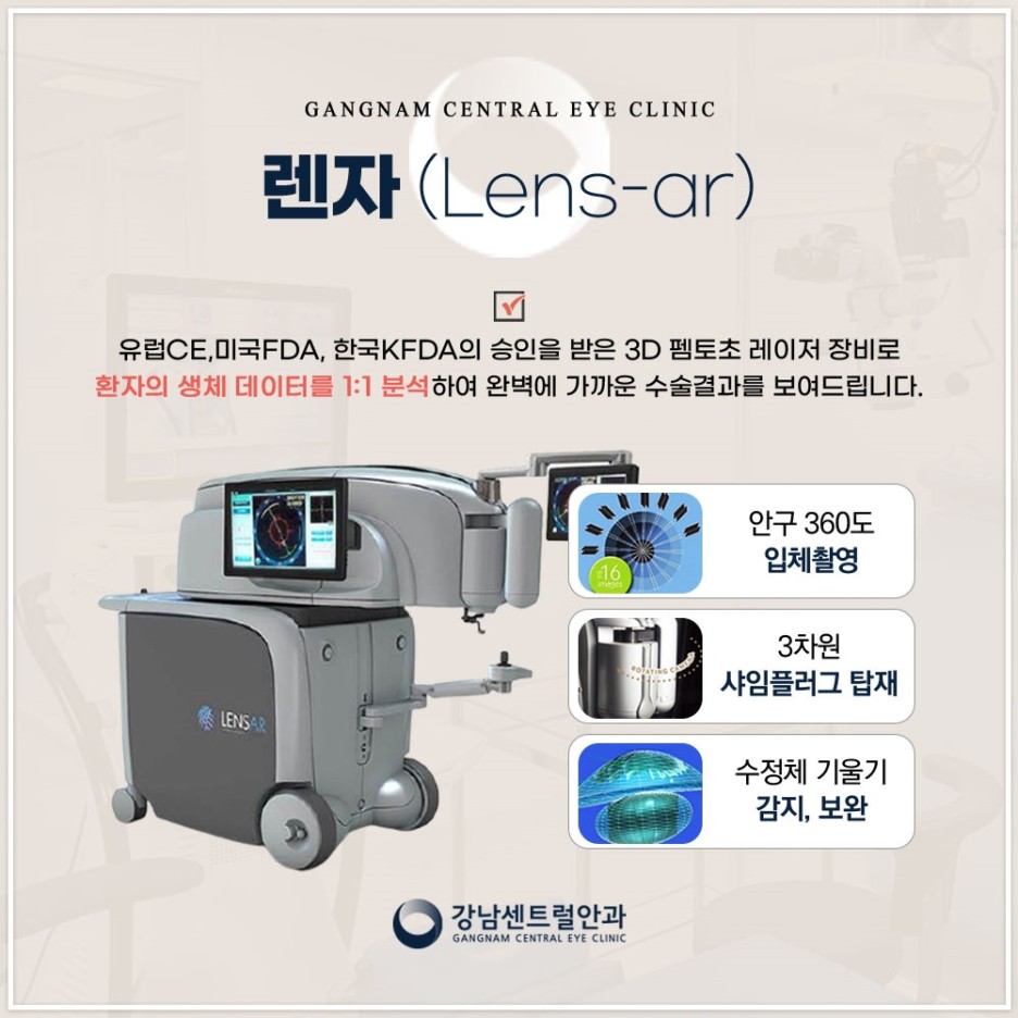 이때 사용되는 레인저 레이저 장비는 초고속 샤임 플러그 카메라를 이용하여 안구를 360도 각도에서 촬영 및 스캔, 증강현실 기술을 접목하여 각막과 수정체의 모양이 일그러진 정도까지 있는 그대로의 모습을 구현합니다.