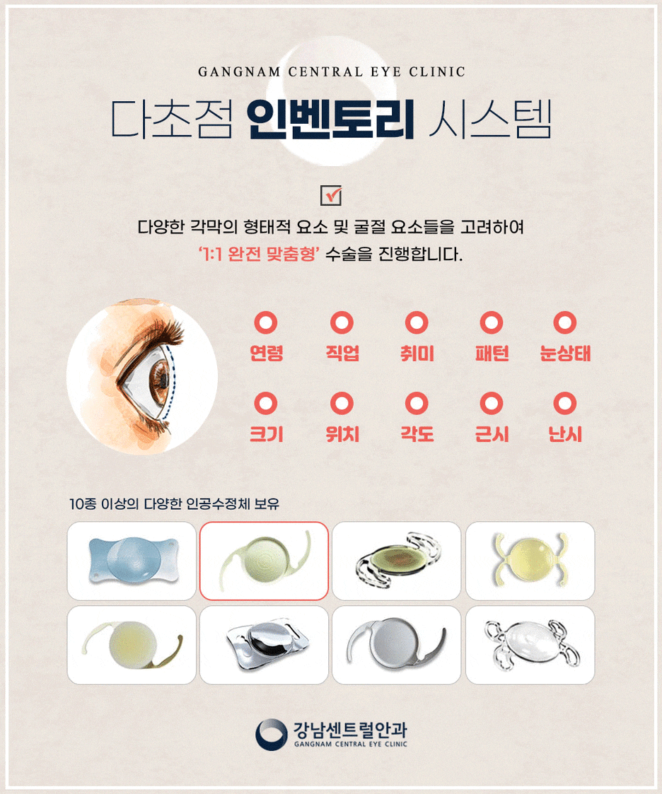 단순히 시력저하 정도만 확인할 것이 아니라 환자 개개인의 나이, 직업, 생활패턴 등을 고려해 맞춤 인공수정체를 선택해야 만족스러운 결과를 기대할 수 있습니다.