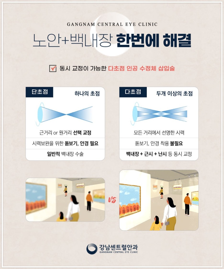 그러나 다초점은 백내장이나 근시, 난시를 함께 개선함으로써 모든 거리에서 선명한 시력을 얻을 수 있어 수술 후 교정기 착용이 불필요해져 편리한 일상생활이 가능합니다.