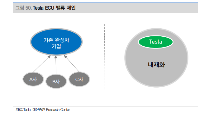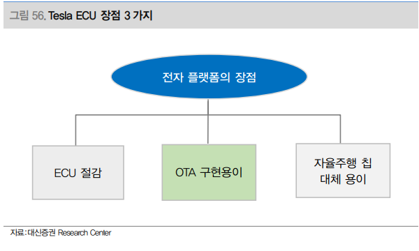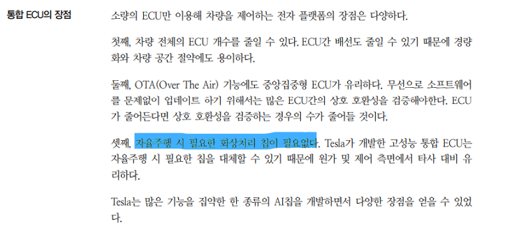 차량용 ECUTesla는 고성능 통합 ECU 1개, 제어를 위한 보조 ECU 3개 총 4개 ECU