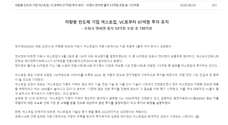 국내 유일의 ISP, AHD 기술을 확보한 기업.ISP, AHD 기술은 ADAS와 자율주행에 필수적인 카메라 기술로, 이 회사가 90.9% 지분을 보유한 넥스트칩이 위 기술을 보유하고 있다.
