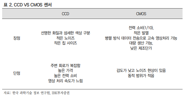 CCD(Charge Coupled Device): 빛에 의해 발생한 전자를 그대로 전송하는 방식을 사용하는 센서. CMOS(Complementary Metal Oxide Semiconductor): 빛에 의해 발생한 전자를 전압으로 변환하여 전송 센서.