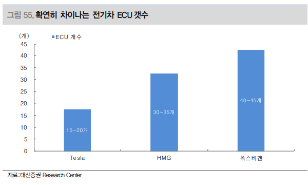 기존 완성차는 분산형 전자플랫폼 방식으로 ECU와 각 부품이 1:1로 연결되는 시스템이다.폭스바겐 내연차량은 70개의 ECU 전기차도 30개의 ECU