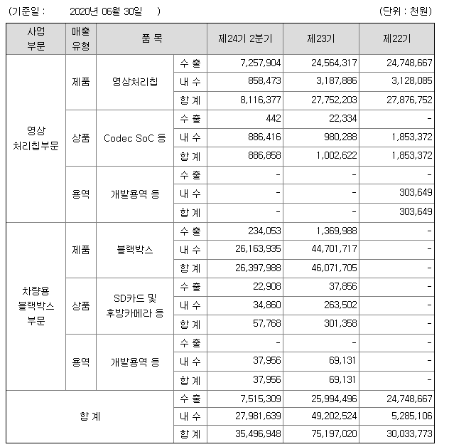 매출처 2022 SoC 일본 납품 개시 아파치 4:VD(차량인식) PD(보행자인식), MVD(이동물체감시), LD(차선인식) 기능 수행 가능.차량 후방 부분을 전담하는 SRV(Smart Rear View)에 사용될 예정이다.