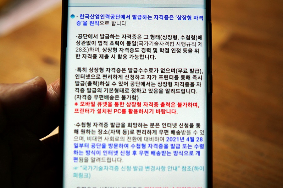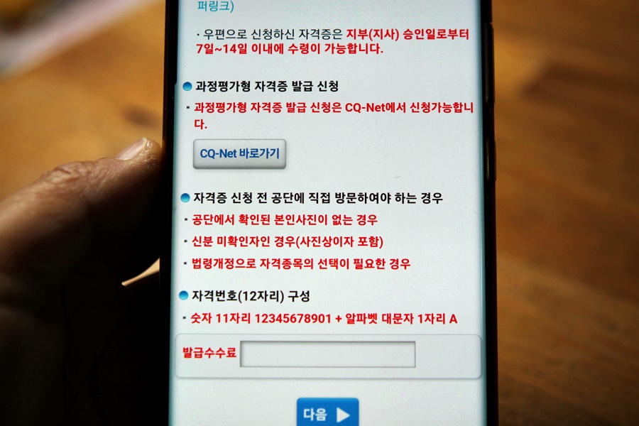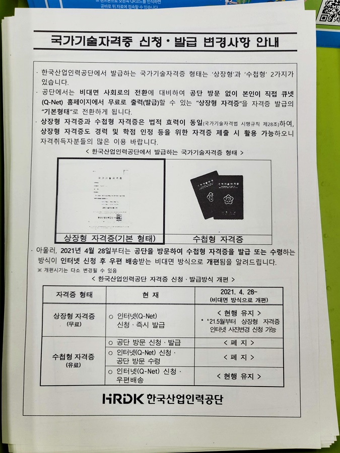 다만, 최근에는 비대면 사회로의 전환에 대비해 큐넷 홈페이지에서 출력하여 사용할 수 있는 상장형 자격증의 발급이 기본적인 것이 되고 있다고 합니다.저처럼 수첩형 자격증을 꼭 재발급 받지 않고 공단에 방문하지 않고 홈페이지를 통해 무료로 출력해서 쓸 수 있으니까 어쩌면 이것도 편하게 쓸 수 있을 것 같았습니다.그래도 저는 너무 오랜만이라 수첩형으로 발급받아 보관하고 싶어서 우편요금과 발급요금을 내고 우편으로 수첩형 자격증을 신청해 놓았는데 배송이 되기까지 한 열흘정도 걸린다고 합니다.