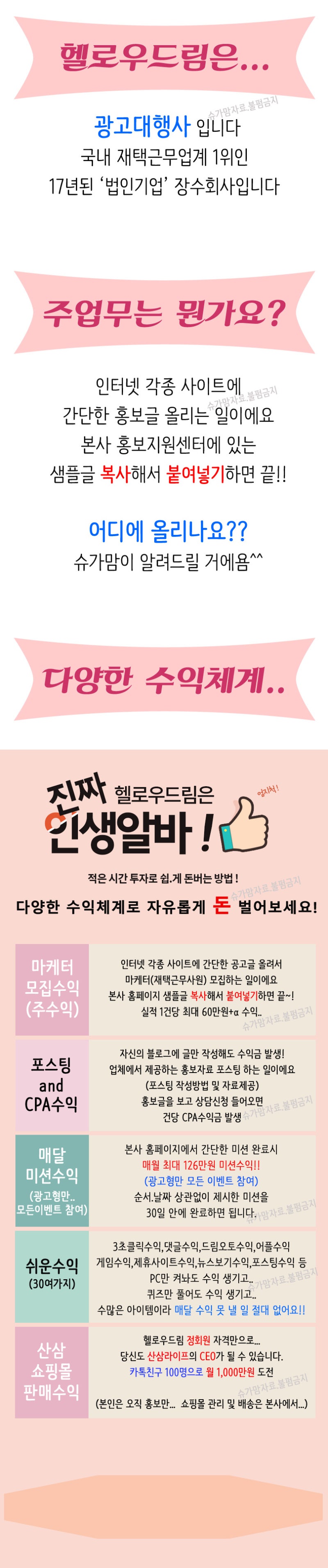 여러분도 출퇴근하는 힘들고 어려운 아르바이트 말고 저처럼 집에서 쉽게 일을 해서 더 쉽게 수익을 내보세요.저는 시작한지 7개월째인데 만족도는 최고입니다.다양한 재택근무 아르바이트 아이템 더 자세히 보기>