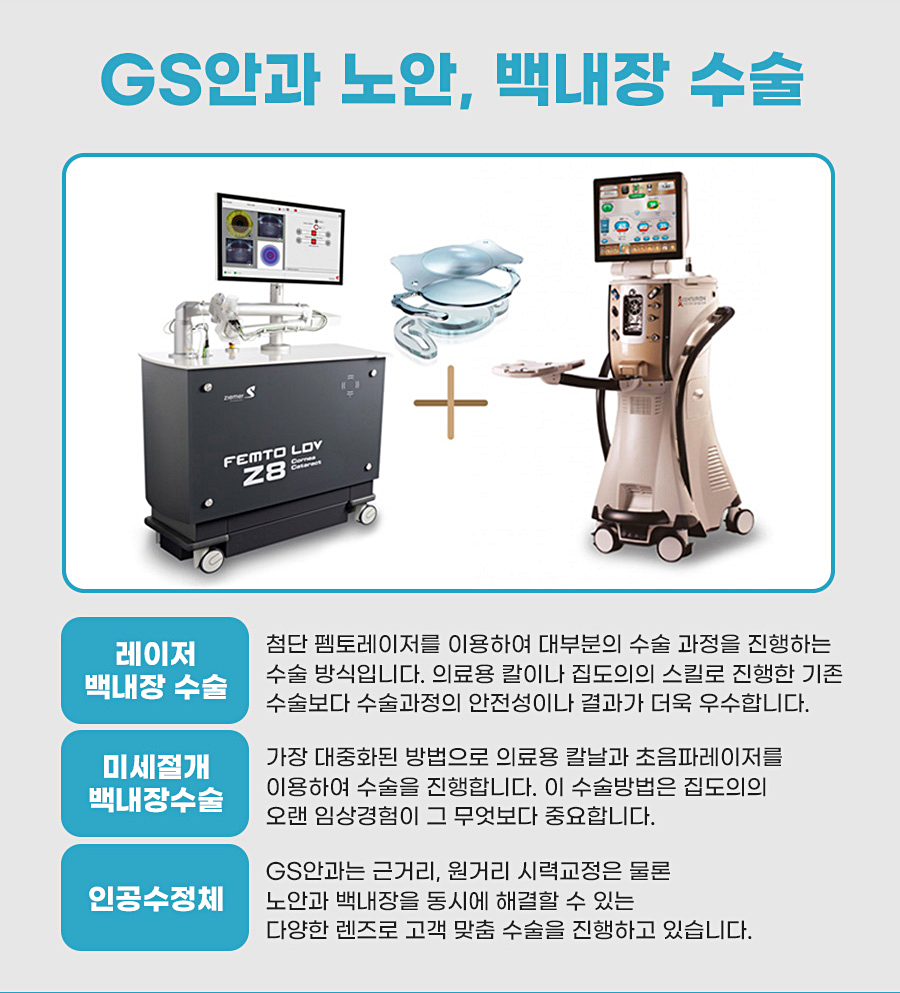 모든 수술은 진행 과정도 중요하지만 오차 없는 진단이 결과에 많은 영향을 미칠 수 있었습니다. 대학병원이나 큰 병원에서도 볼 수 없는 IOLMASTER 700 레이저 장비를 보유하고 있다면 각막과 망막 등 모든 부위에 초정밀 안구 검사가 가능해 안정성을 높일 수 있었습니다. 3차원으로 눈을 분석할 수 있는 GALEIG6를 보유하고 있다면 전안부에 대한 모든 정보를 알 수 있고 더 좋은 결과로 이어지는 만큼 단순히 노안 백내장 수술 비용이 저렴한 곳을 선택하기보다는 첨단 장비 보유에 대한 확인이 필요했습니다.