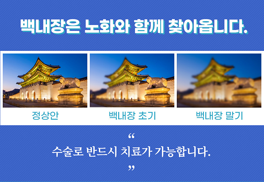 특히 백내장의 경우 과거에는 노인성 질환으로 분류됐지만 최근에는 여러 이유로 발생해 10대~20대 젊은 연령층도 안심할 수 없었습니다. 그 중 큰 원인은 스마트폰과 같은 전자기기의 사용량이 많아지면서 눈의 노화가 빠르게 시작될 수 있었습니다. 또한 눈의 염증이나 외상, 당뇨와 같은 전신질환을 비롯하여 태아 때 감염이나 대상 이상으로 선천적으로 나타나기도 하였으나 그 증상을 모두 같기 때문에 수술을 통해 치료를 받을 수 있었습니다.
