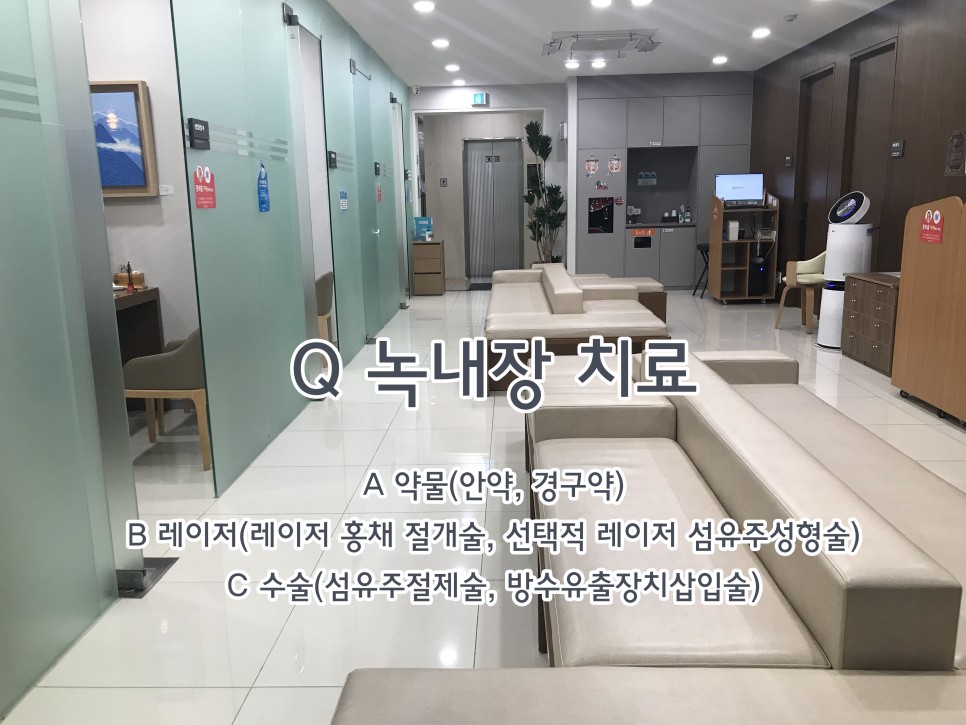 녹내장 치료는 수술, 레이저, 약물의 세 가지 유형으로 나눌 수 있습니다. 세 가지 방법의 목적은 방수 배출을 높이거나 생성 자체를 억제하여 눈 속의 방수량을 줄이고 안압을 낮추는 데 있습니다. 높지 않은 안압이라 하더라도 시신경 손상과 시력 문제가 발생할 경우 보다 낮추는 과정이 필요합니다. 따라서 초반에는 약물을 점안하는 방법을 사용하지만 이것만으로 원하는 결과를 얻지 못하는 경우가 생기기 때문에 레이저 및 수술을 통해 치료를 진행하는 비율이 더 높습니다.