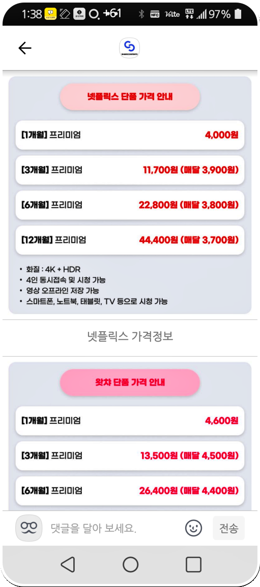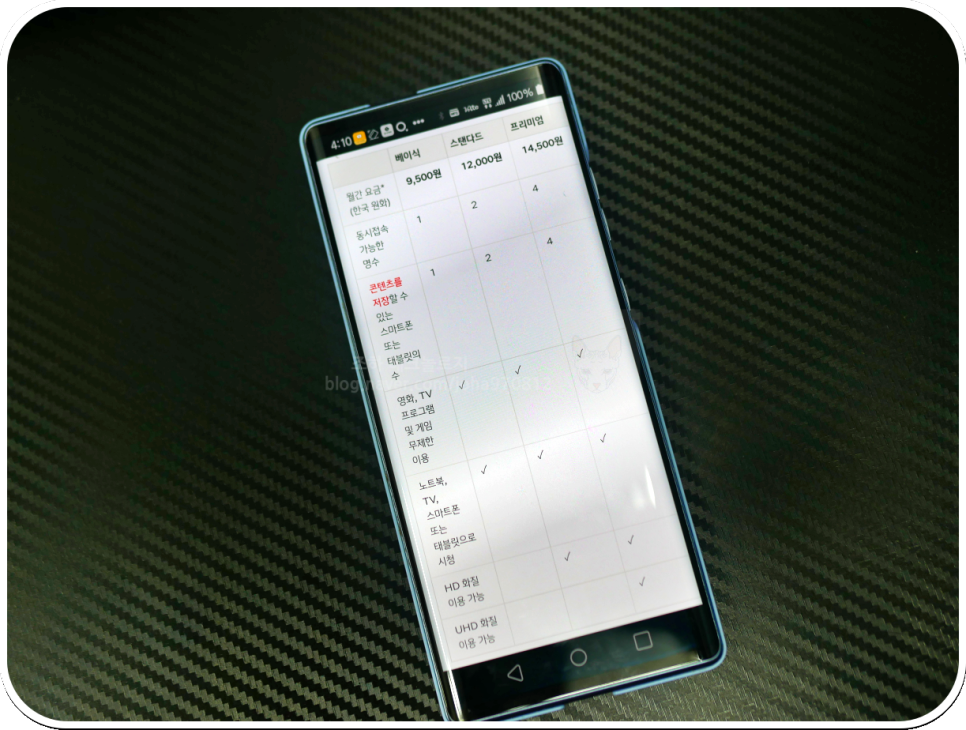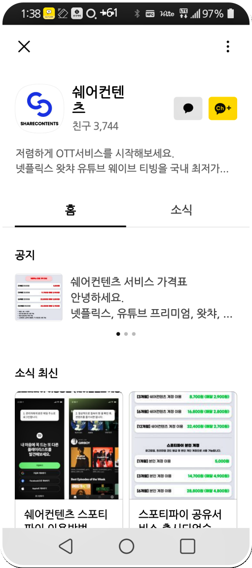 그런데 얼마 전 뉴스를 보면 넷플릭스 요금제에서 프리미엄을 이용하고 다른 사람과 점유율을 해서 N분의 1로 나눠 시청하는 사람도 있었습니다. 지인이 있거나 가족이 많으면 괜찮다고 생각하지만, 저는 혼자 살아서 그런지 별로 흥미가 없었습니다. 그런데 카카오톡 채널에도 이런 점유율을 전문적으로 하는 곳이 생겼거든요. 여기서는 모르는 사람과 공유하여 나눌 수 있는 것이 장점입니다. 근데 이것도 왠지 어색해서 저는 그냥 베이식스를 쓰고 있는데 넷플릭스 가격은 이용자 상황에 맞게 급별을 잘 해놓은 것 같아요.