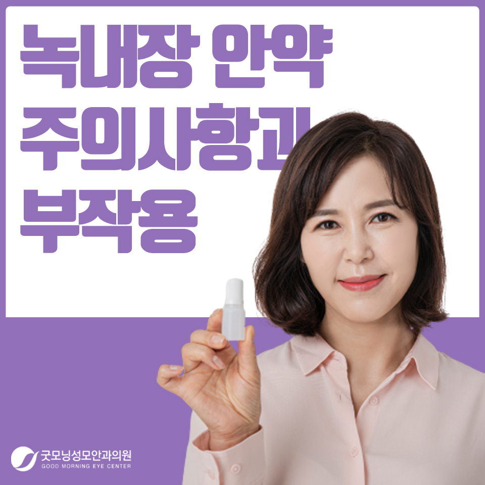 <녹내장 약물치료>는 환자의 순응도가 매우 중요한데요. 환자의 눈 상태에 따라 다양한 안약이 처방되며 녹내장의 진행 정도, 안압 조절 상태, 부작용 등에 따라 적절한 안약으로 교체하거나 추가하기도 합니다. 먼저 매일 정해진 시간에 한 방울만 아래 눈꺼풀 아래로 당겨 열린 공간에 점안하시면 됩니다. 안약이 2종류 이상일 경우 5~10분 간격으로 점안하셔야 합니다. 안약의 유효기간이 있으면 1개월 이내에 사용하시고 기간이 지나면 즉시 폐기해야 합니다. 녹내장 안약을 점안하는 것을 잊으면 즉시 점안하시기 바랍니다. 그러나 녹내장 안약에는 여러 가지 부작용이 있을 수 있습니다만. 부작용으로 인해 안약을 중단해서는 안 되므로 전문의에게 증상을 말씀하시고 같은 효과의 다른 안약으로 바꾸는 것이 좋습니다.녹내장 안약 부작용