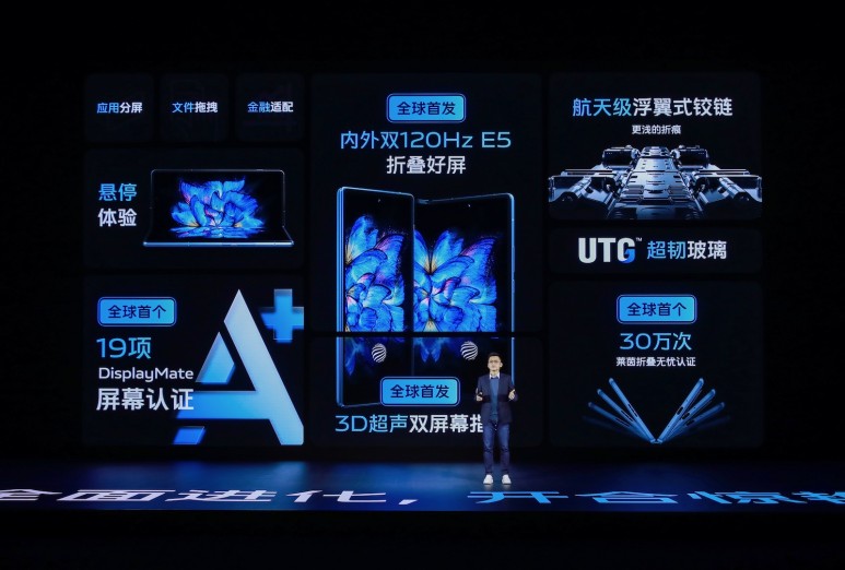 (출처: Vivo) 디스플레이는 삼성디스플레이 E5 아몰레드(AMOLED)를 탑재했다. 외부 디스플레이는 6.53인치 크기에 21대 1 비율의 FHD+(2520×1080) 해상도를 갖고 있다. 내부 디스플레이는 8.03인치로 4대 3.55 비율에 2160×1916이라는 독특한 해상도를 적용했다.