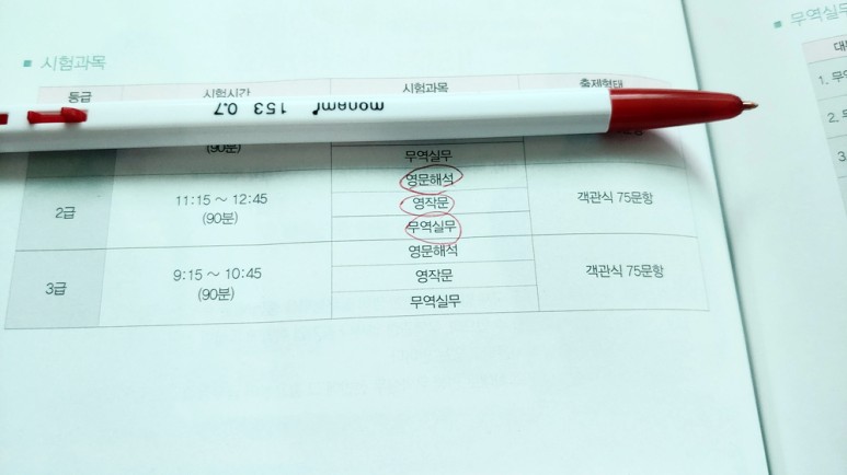 시험 과목 자체는 한 과목 영문 해석, 두 과목 영작문, 세 과목 무역 실무에서 같은 과목에서 시험이 실시되고 있고, 문항 수도 25문항으로 같고 시험 시간도 90분으로 똑같습니다.