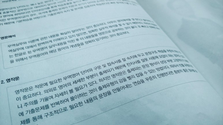 영어 과목의 경우 당연히 영어를 잘한다면 유리할 수밖에 없겠지만, 아까 말씀드린 것처럼 같은 단어라도 다른 의미로 쓰이는 단어들도 많고 낯선 무역 단어도 존재하기 때문에 그런 부분들을 반드시 우선적으로 정리해서 파악해 두는 것이 좋습니다. 어느 정도 기본적으로 영어실력이 있다면 이런 부분만 잘 정리하면 해결될 것 같습니다.