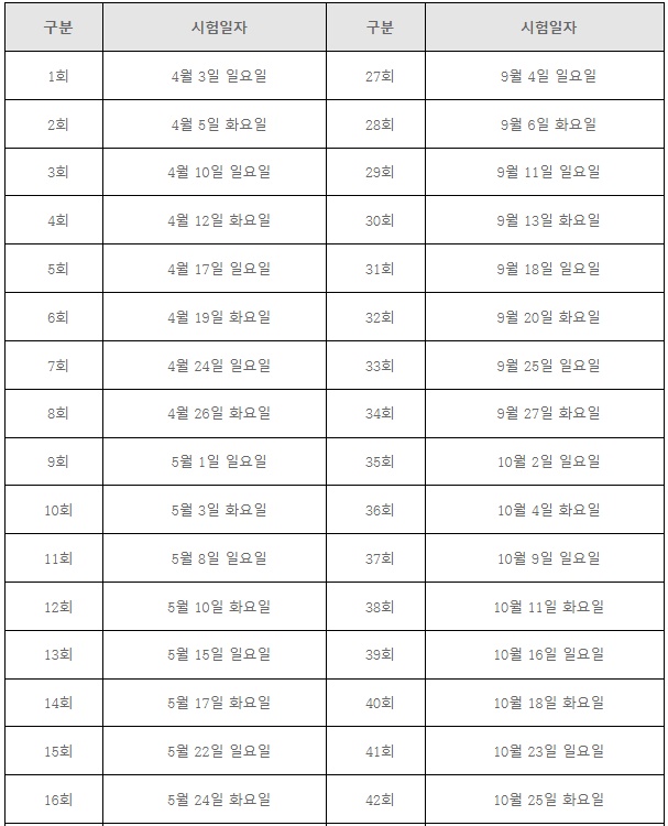 단, 기간은 지정되어 있으며, 해당 기간에만 실시됩니다.4월~6월까지, 9월~11월까지 화요일과 일요일에만 실시되고 있습니다.이번 2022년 무역영어 2급 시험은 총 52회의 시험이 실시됩니다.참고로 상반기 마지막 시험은 26회 시험인 6월 28일 화요일 시험입니다.하반기 최종 시험은 52회 시험의 11월 29일 화요일 시험입니다.