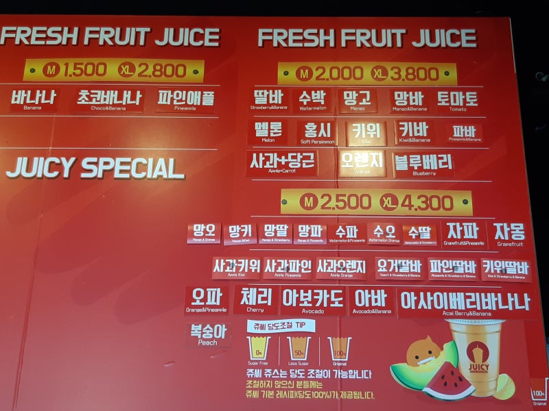 필리핀, 페루, 미국 등 많은 나라에서 수입하고 과일 보관을 천평 규모의 창고에서 진행해서 공급받아서 가성비 좋은 주스를 맛볼 수 있는 거야~! 카페에 가도 원두라든지… 어떻게 생산되는지 별로 궁금하지 않았는데 JUICY는 과일당도 좋지만 저렴해서 어떻게 이걸 할 수 있는지 유심히 볼게요.과일주스쥬시 메뉴 가격~~주씨의 단점이 있다면 매장마다 판매하는 과일주스 종류가 다르다는 것.!(풀메뉴는 아래 키오스크 화면을 참조해주세요~!) 이곳은 수박주스가 없었습니다. 수박주스 먹고 싶었는데 겨울에 주문한 적이 있어서 있는 줄 알고 들어왔는데 없네요.ㅎㅎ 그래도 수박 다음으로 제일 좋아하는 오빠는 있어서 오렌지+파인애플 주스 마셨어요.커피 가격도 여전히 좋네요.예전에 쥬시 아메리카노를 자주 마셨는데 원두커피도 고소하고 맛있었어요.그리고 와 카페라떼 카푸치노 가격 실화야?M사이즈 1,500원~~요즘 흰우유 작은팩 사도 천원인데 테이크아웃밖에 안되는데 싸고 좋고 또 카푸치노가 아이스로 주문하시는 것도 좋네요.요구르트 스무디 M 사이즈가 되는 게 너무 좋네요. ㅋㅋㅋ 항상 양이 너무 많아서 먹기 힘들었는데 당도 그만큼 많이 섭취하게 되니까요(눈물) 집이랑 가까웠으면 매일 들렀을텐데 아쉬워요.특히 자취할 때 정말 자주 사먹었던…^^ 이렇게 과일을 섭취하는 게 더 저렴해지기 때문에.키오스크에서 주문~~뭔가 요청할 것이 많을 때는 특히 키오스크가 편합니다(선택지) Size M과 XL의 양은 2배 이상이지만 가격은 1,800원밖에 추가가 되지 않습니다.근데 맛도 더 싱거워서… 맛만 보면 그렇게 추천하고 싶지 않네요.엑스라지는 물맛이 나고 싱거우니까 M으로 2잔 마시는 게 좋을 것 같았어.~당도는 (설탕 시럽)100%50%0%나는 항상 50%로 0%하면 과일의 단맛만으로 단맛을 채우기에는 역시 무리인지 너무 삼매경..100%는 단맛은 가득하지만 어떨 때는 조금 달기도 하고 과일의 천연 단맛보다 설탕 시럽의 맛이 강해서 뒷맛이 깔끔하거든요.제 입맛에는 중간이 딱 좋아요(!!) 2%의 단맛이 부족한 느낌인데 뒷맛도 깔끔하고 과일 특유의 단맛이 잘 느껴져서..(웃음)1,500원은 바나나가 유일무일~가격 2천원은 귤, 파인애플, 초코바나나가 있습니다.제가 좋아하는 과일주스 메뉴는 오빠와 딸기 그리고 수박입니다. 전에 맛본 오렌지 자몽은 자몽의 씁쓸함이 있기 때문에 파가 진리라는 생각이 들었습니다.(내 입에는 웃음)모듬과일컵~~ 쥬시락도 있네요 비타민 섭취가 부족한 현대인에게 딱 맞는 과일은 정말… 먹기 귀찮고, 따로 사먹으려면 비싸서 냉장 보관 중 부드러워져서 버리는 경우도 많아서요. 다양한 과일을 먹을 수 있는 과일컵이 최고인 것 같아요. 개인적으로 과일 화채도 나왔으면 좋겠어요. 딸기우유를 부은 수박펀치나 멜론우유 살얼음이 들어간 멜론 과일 화채 같은 거. 큐! 하지만 이제 겨울이니까 발매할 거라는 기대는 꿈에도 생각하지 마세요. ㅎㅎㅎ요즘은 체리가 들어간 음료가 많이 나왔네요~~M/XL/젤 오른쪽에 있는 것은 (배달용)역시 오빠는 배신하지 않는 맛이 나는 비타민충전~햇살을 맞으면서 먹고 비타민D도 충전~일반 오렌지, 파인애플 주스보다 확실히 오렌지+파인애플이 맛있어요 ㅎㅎ 이 조합은 여기서 처음 먹어보고 어인ㅇ_ㅇ!! 해봤는데 너무 잘 어울리는 것 같아요. ~새콤달콤해 ㅎㅎ 마음을 담아서 채워.그리고 싸게 마시는 저의 방법.. 작은 요령입니다.그래도 500원 정도 차이가 나는데 할인해서 드시면 더 맛있어요 ㅎㅎ 바로 할인된 심콘 이용하기~게다가 1000캐시를 더 받아서 더 싸게 마시기 저번에 올린 저의 할인팁 리뷰를 참고해주세요——-!!솔빈 애플망고치즈빙수 추천 포장 배달 리뷰 솔빈 할인해서 사먹는 팁은 맨 밑에 소개 솔빈 이거 얼마만이야~!! 4년만에 먹어보는 것 같아.m.blog.naver.com솔빈 애플망고치즈빙수 추천 포장 배달 리뷰 솔빈 할인해서 사먹는 팁은 맨 밑에 소개 솔빈 이거 얼마만이야~!! 4년만에 먹어보는 것 같아.m.blog.naver.com