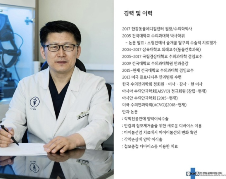 한강동물메디컬센터 강명곤 원장은 반려동물안과 전문 대표 수의사로서 국내 수의사 안과에 크게 기여하고 있는 실력파입니다.