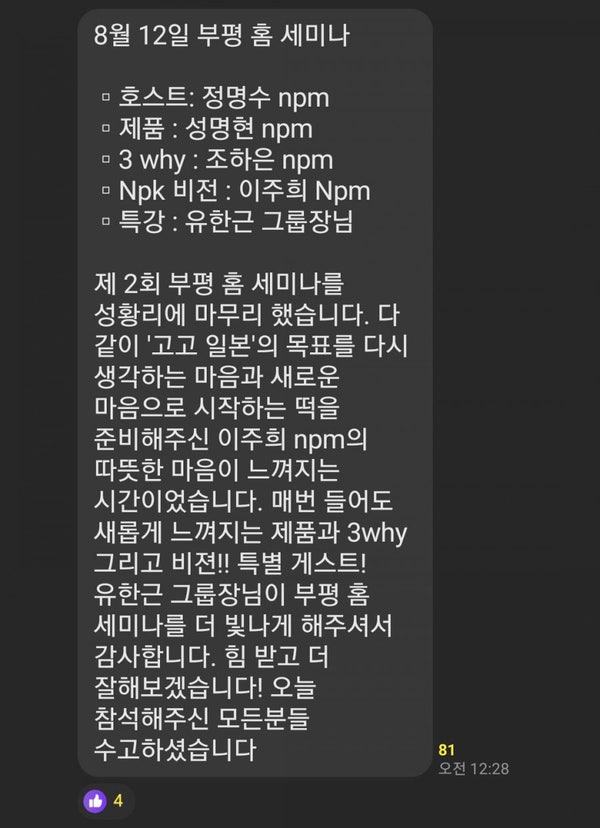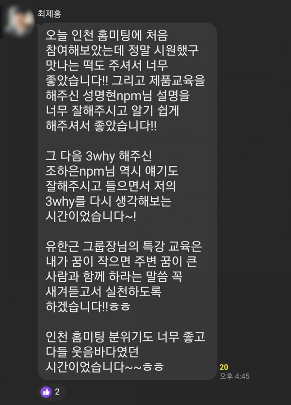 I’m Juli, the representative of the regional home meeting.It’s already been three months since we started our home meeting in the Natural Plus region. Now that I think about it, I have been here every Friday, starting on May 13th. The home seminar, which started at a small workshop in Bucheon for about 3 months, has opened a new space in Bupyeong, Incheon, so I can proceed more spacious and comfortable. It was the 14th time of the home meeting and the 2nd seminar in Bupyeong on Friday. Many people visited us as a side job as an office worker.This week, the instructors are changing every week, and a slightly simple but intense special lecture is available.After the product, 3 why, and vision lectures, a special lecture for the group leader was prepared. I left at 2 o’clock in the morning with my heart full of excitement.This is the 2nd Incheon Home Seminar, and they have designated it as the official opening date and prepared a small gift! Enjoy your meal and celebrate. Incheon will grow bigger from now on.