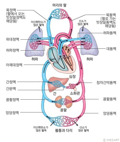 2) 혈관① 동맥 (4 mm) : 심장 → 말초혈관, : 심장으로부터의 혈액 통로 압력이 높고 혈관벽이 두꺼워 탄력 섬유가 발달.★관상동맥: 심장의 적절한 산소.영양을 공급하는 혈관②정맥(5mm): 말초→심장으로의 혈관. 판막O(혈액역류방지).★하대정맥(75%) : 복강과 하지에 있는 혈액을 모아 우심방으로 들어가는 혈관. 모세혈관 : 동맥과 정맥을 잇는 가는 혈관, 크기 약 6-10m가 늘어나 가스교환이 용이하다.