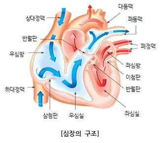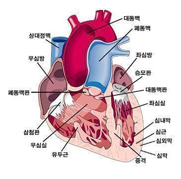 - 심장 구조(주먹만한 원추형 장기, 300g) 위치-양 폐 사이에 위치하며 약간 좌측 기울임/흉부 양쪽 폐 사이의 횡경막 상부 심장은 60100회 박동, 1회 70cc 정도의 혈액을 분당 5L 하루 7L 이상의 혈액을 뿜어낸다.③심장 밖을 순환, 심장 근육에 산소와 영양을 공급하는 관상동맥으로 둘러싸여 있는 ④2개의 심방과 2개의 심실에 4개의 방과 4개의 판막이 있다, 전신에 혈액을 뚫는다(혈액량=체중의 7%) ★높은 압력을 견디기 위해 좌심실이 우심실 벽보다 3배 정도 두꺼움 *우심장:소순환(폐순환): 심장과 폐 사이의 순환(정맥혈을 받아들여 폐로 보내 산화), CO2 많다 *좌심장:대순환(전신체 순환): 심장->신체 각 부분.O2 많은 신선한 혈액을 폐로부터 받아들여 동맥을 통해 전신에 영양공급, * 심장벽구조 : 심근→ 심장내막→ 심장외막→ 심장막강(심낭액: 마찰방지의 윤활제 역할) ● 판막: 혈액역류방지(4개의 판막) ● 삼첨판막: 우심방과 우심실 사이의 판막 ● 이첨판막(승모판막): 좌심방과 좌심실 사이의 판막: 우심실과 폐동맥 사이 ● 대동맥판막: 좌심실과 대동맥: 좌심실)② 우심실: 우심방에서 혈액을 받아 다시 폐동맥을 통해 폐로 보낸다.③ 좌심방: 폐에서 모은 혈액을 4개의 폐정맥을 통해 받아들인 뒤 다시 좌심실로 보낸다.④ 좌심실: 가장 큰 방, 대동맥을 통해 산소가 많이 포함된 혈액을 신체로 보낸다.