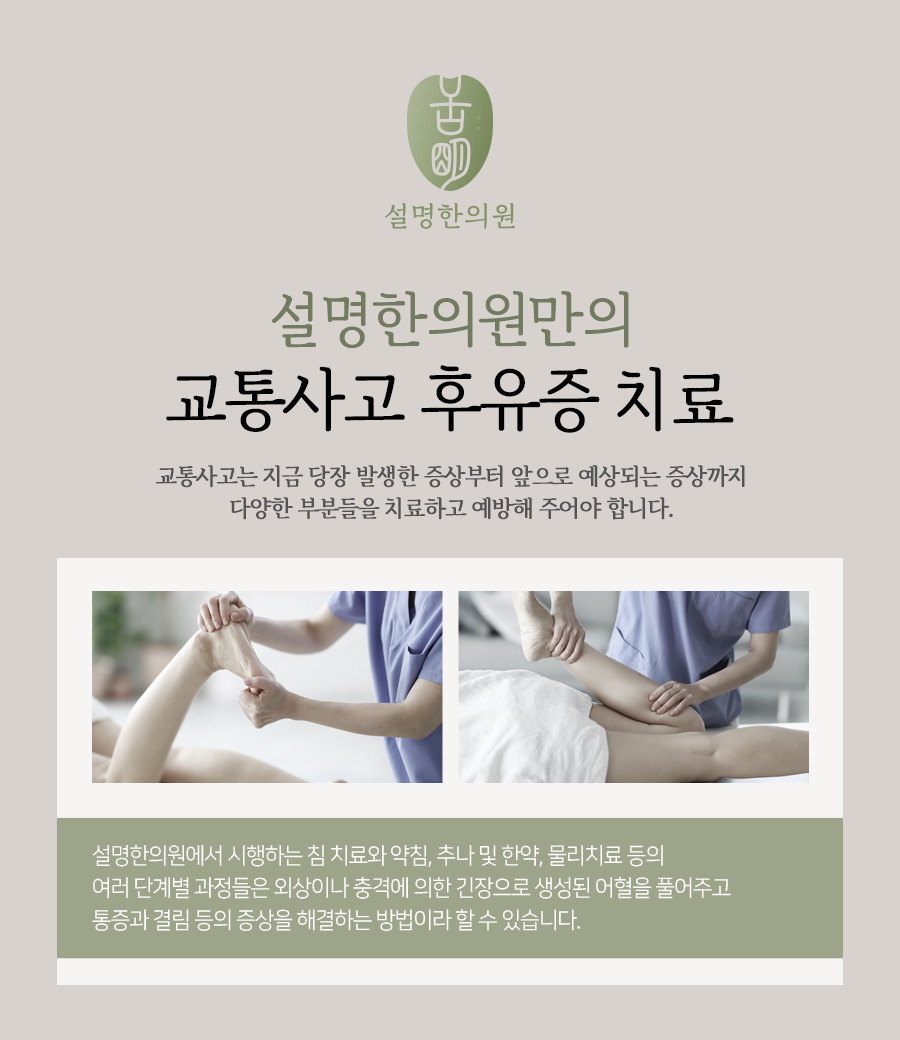한의학에서는 일찍부터 해독이라는 개념이 있어 교통사고로 인해 지속적으로 생긴 노폐물이 밖으로 잘 배출되지 않거나 쌓이면 근골격 계통의 통증은 물론 장부 손상으로 이어질 수 있음을 주의해야 했습니다.