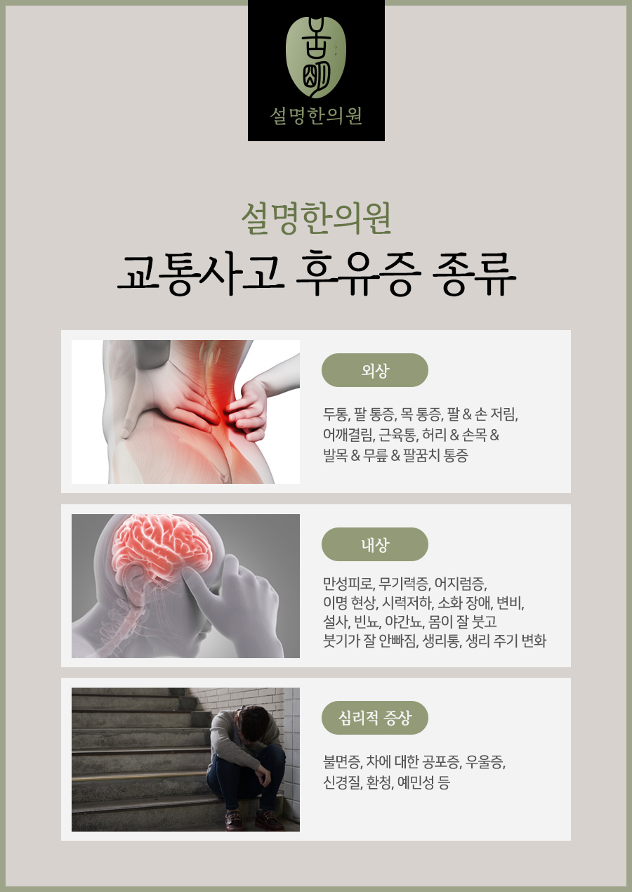 차량의 종류에 따라 사고로 인한 타박상이나 골절 등은 다양한 형태를 띠고 있어 많은 사람들이 신체의 외부적인 관리를 받고도 내부적인 증상에 대해서는 대응하지 못하는 경우가 많았습니다.