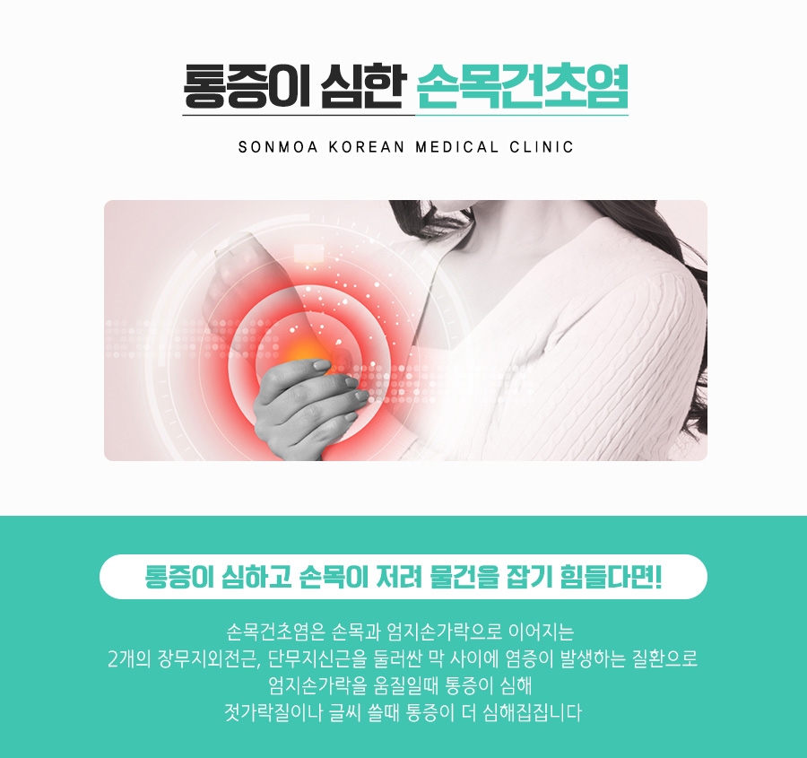 대부분 손목을 과도하게 사용하는 과정에서 통증을 느끼는 경우가 많았습니다. 많은 시간을 스마트폰을 만지는데 사용하다가 그중에서도 손목에 부담을 주는 행동을 반복하다 보니 자연스럽게 손목이 망가지게 되었습니다. 가급적 심각한 상태가 되지 않도록 막기 위해서는 조기에 부종이나 염증을 제거하는 것이 중요했습니다. 이때 한방병원을 방문했더니 각기 다른 증상에 맞춰 물리치료를 할 수 있었습니다. 또한 건초염 증상이 나타나면 항염 및 소염작용이 뛰어난 한약재와 약침치료를 병행하는 것이 좋았습니다.