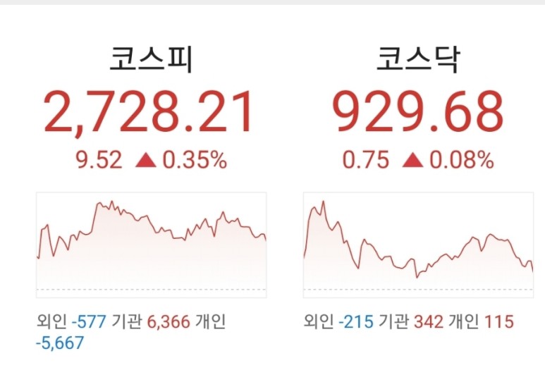 • 코스피는 전 거래일보다 +9.52P(+0.35%) 상승한 2,728.21로 마감했고 코스닥은 전 거래일보다 +0.75P(+0.08%) 상승한 929.68로 장을 마쳤다.