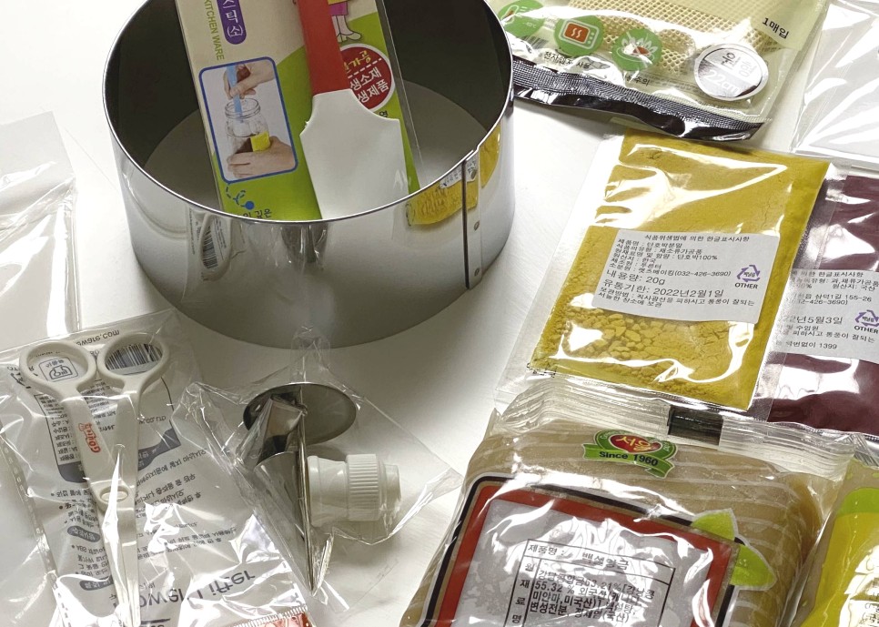 팥,천연분,깍지,실리콘헤라,스크래퍼,꽃가위,케익틀,화대,찜천,짜개주머니,커플러등 바로 연습할 수 있는 재료없이 보내주셨습니다. 🙂