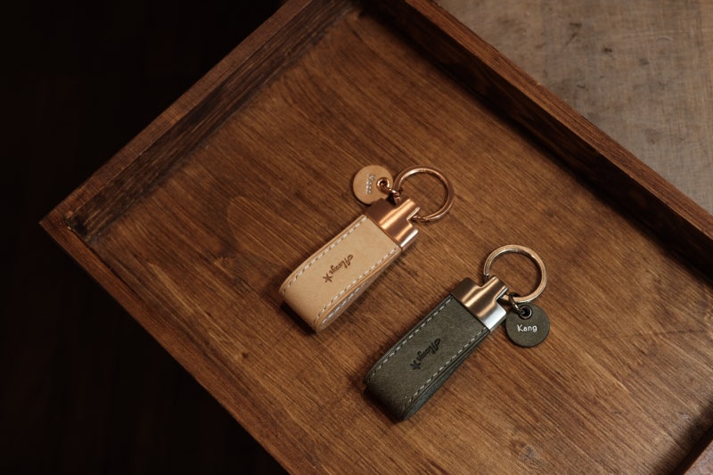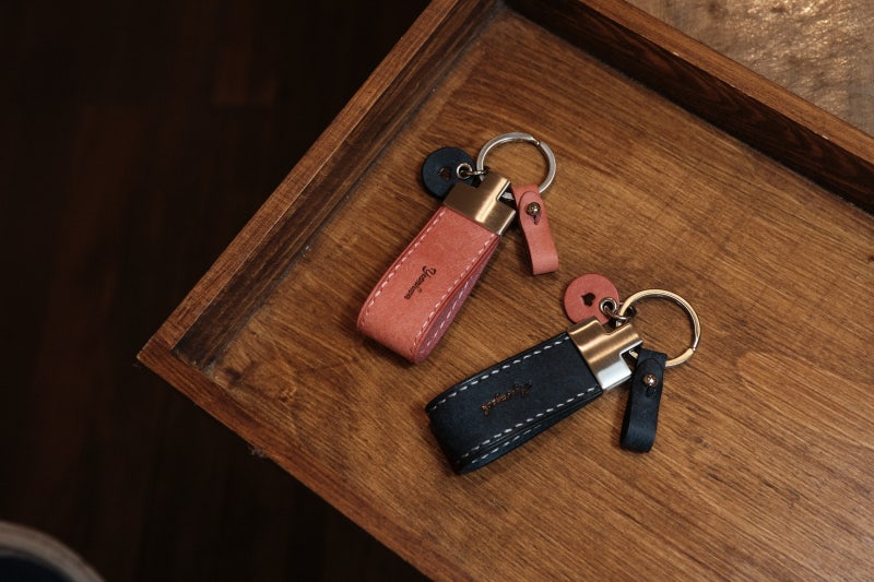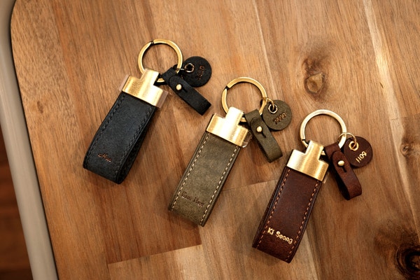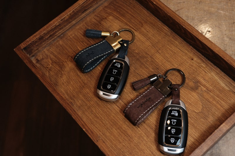 기본 가죽 키링에 스마트 키를 편하게 걸 수 있는 열쇠고리와 이니셜을 넣을 수 있는 미니 태그를 추가하였습니다.미니 태그에는 하트 하나만 각인하고 컬러를 교체하여 커플링감이 나도록 마무리하였습니다.