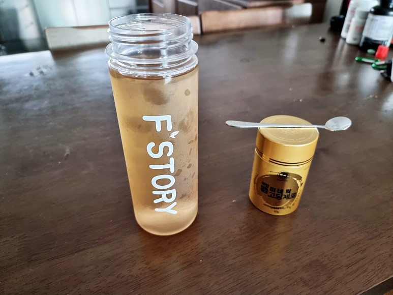 저는 물 500ml에 1/2스푼을 넣어서 들고 다니면서 먹어요 ^^ 맨날 출근할 때 물 타서 차로 마시고 있어요 고당 제로를 넣고 물처럼 먹으면 딱 좋아요얘가 조금 써요~~ 물을 많이 넣어서 중화?를 시켜주니까..조금 적습니다ww