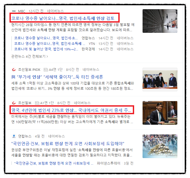 코로나 영수증이 날아오나?영국 법인세·소득세 인상 검토 재무장관 “재정 지속가능해야” vs “너무 빠르다” 논란 자영업자 7조8천억원 등 코로나 지원 지속..테크기업 창업 촉진 (런던=연합뉴스) 최윤정 특파원 = 신종 코로나바이러스 감염증(코로나19) 사태 충격을 막기 위해 자금을 풀었던 영국 정부가 이제 세금을 거둬 나라 곳간을 채울 채비를 하고 있다.28일(현지 시간) 영국 언론에 따르면 정부가 다음 달 3일 발표할 예산안에 법인세와 소득세 인상 계획이 포함될 것으로 알려졌다.정부는 법인세율을 현행 19%에서 2024년까지 23%로 올리는 방안을 검토하고 있다. 일각에서는 목표가 25%라는 보도도 나온다.또 소득세 면세점을 최소 3년간 인상하지 않는 방식으로 소득세를 더 걷을 계획이라고 더 타임스가 보도했다.선데이 텔레그래프는 정부가 온라인 배달에 세금을 부과할 예정이라고 전했다.