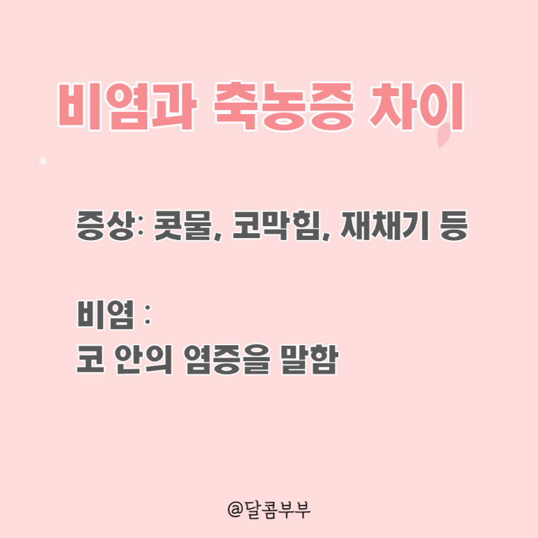 먼저 비염과 축농증상과 정의를 먼저 알게 되면 비염은 콧속의 염증을 의미하며 급성 비염, 알레르기 비염, 만성 비염으로 나뉘는데 명확한 구분은 없습니다.