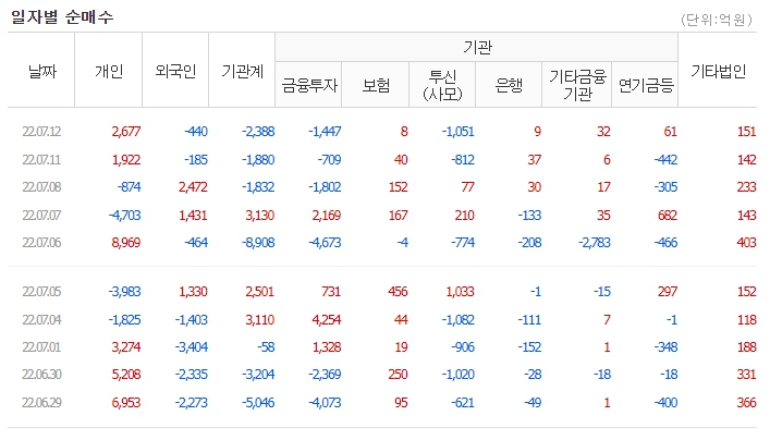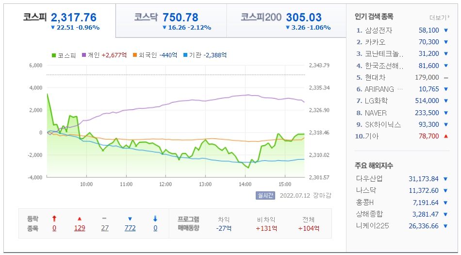 ▲인플레이션 금리 인상 압력에 투자심리 위축=7월 12일 화요일 국내 증시는 인플레이션 물가 상승과 국내 금리 인상, 전날 미국 뉴욕증시의 실적 시즌 실적 전망치 하향 조정 등 경기침체 등으로 하락한 영향으로 1% 이상 하락했다.
