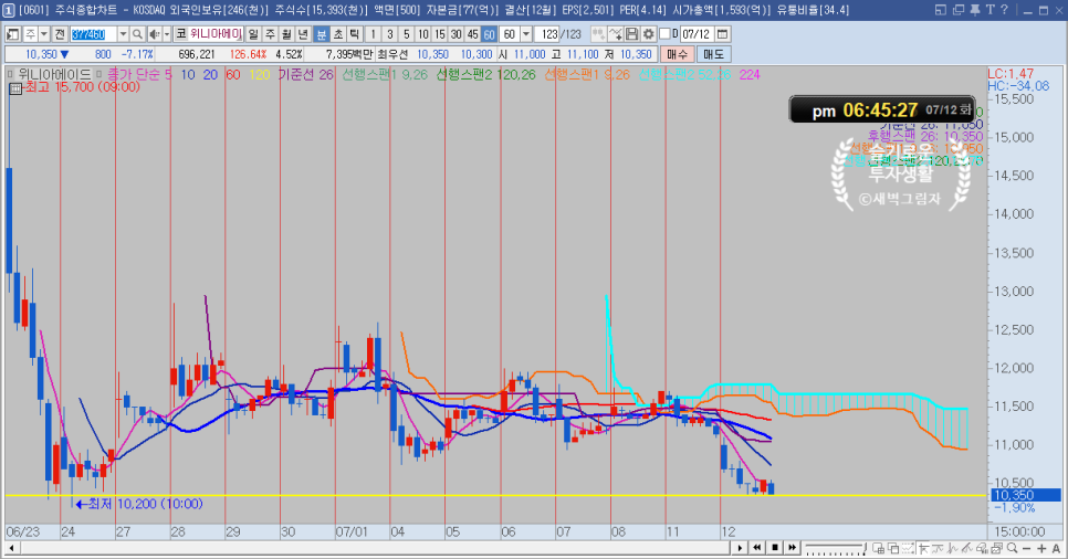 7.12(화) 위니아에이드 주가 60분봉 차트
