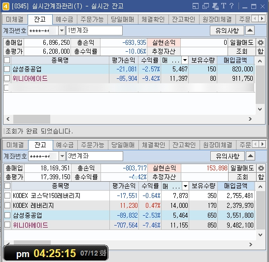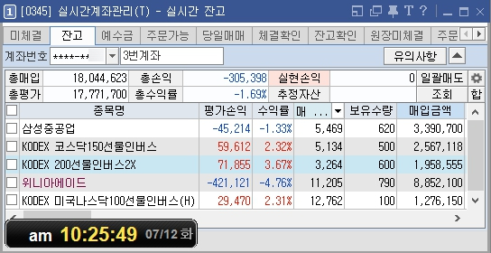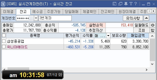 지난 7월 12일(화) 마감 잔액/수익률 현황 위니아에이드로 수익을 여러 차례 내고 과신한 것이 문제였다. 마침 날을 제대로 잡았는지 어제 장 막판 하락세를 그대로 -8%가량 주가를 강하게 내리기 시작하는데 답이 없다.