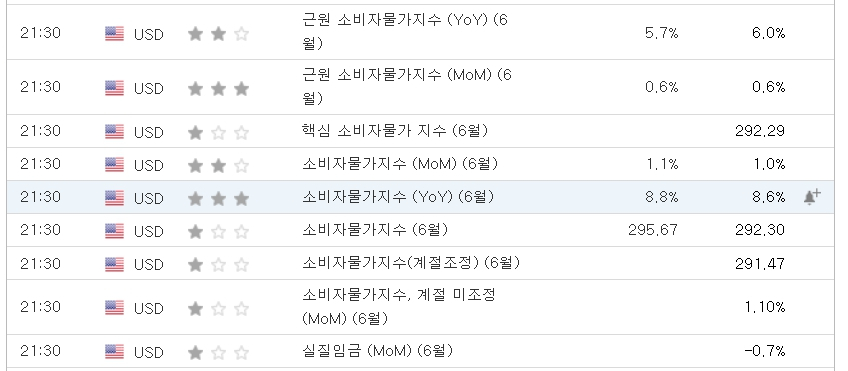 - * 미국 소비자 물가지수 13일 21:30 발표~5월 8.6%→6월 예측 8.8%