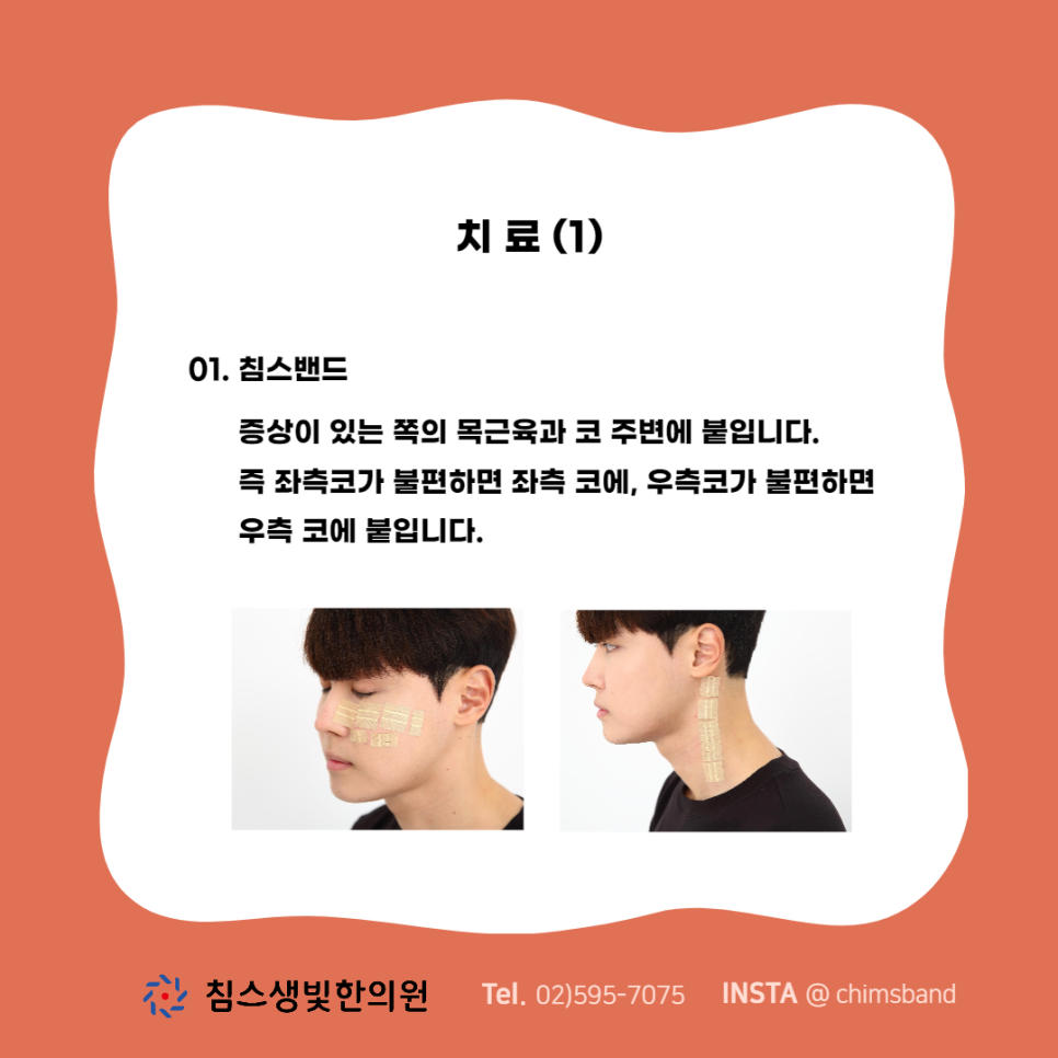 치료 01 침구 밴드 : 증상이 있으신 분의 목 근육과 코 주위에 붙입니다.즉 왼쪽 코가 불편하면 왼쪽 코에, 오른쪽 코가 불편하면 오른쪽 코에 붙입니다.