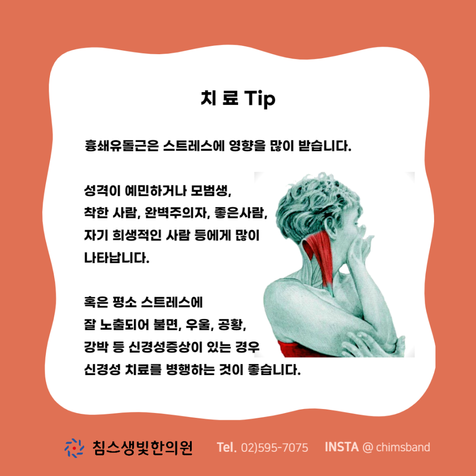 Tip 흉쇄유돌근은 스트레스에 영향을 많이 받습니다. 성격이 예민하거나 모범생, 착한 사람, 완벽주의자, 좋은 사람, 자기희생적인 사람 등에 많이 나타납니다. 혹은 평소 스트레스에 잘 노출돼 불면, 우울, 패닉, 강박 등 신경성 증상이 있다면 신경성 치료를 병행하는 것이 좋습니다.