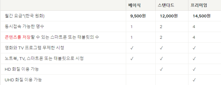 위 이미지는 넷플릭스 홈페이지에서 캡처한 화면입니다. 총 3개의 등급으로 나누어져 있습니다. 등급별로 시청 화질과 동시 접속 가능 인원이 정해져 있네요. 결국 4K UHD급 화질을 즐기기 위해서는 프리미엄급 가입이 필수이고, 프리미엄급 가입을 하면 4명까지 무료로 시청이 가능하다고 해석할 수 있습니다. 가끔 베이직하게 가입해서 4K UHD급 TV를 구입해서 HD급으로만 시청하시는 분들이 계실 수도 있겠지만, 이왕이면 4K UHD급 화질로 콘텐츠를 즐기는 게 좋겠죠?