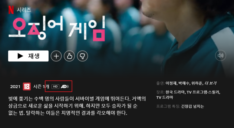 그리고 영상 디바이스에 따라 4K UHD급을 지원하는 디바이스(TV, 휴대폰, PC)는 프리미엄 요금제 가입 시에만 4K UHD급 지원 콘텐츠로 표시됩니다. 제 데스크톱 컴퓨터로 넷플릭스에 접속해 보면 HD급만 지원이 되고 있습니다. 넷플릭스에서 자동으로 기기의 성능을 검색하고 지원되는 화질을 결정해주는 것입니다.